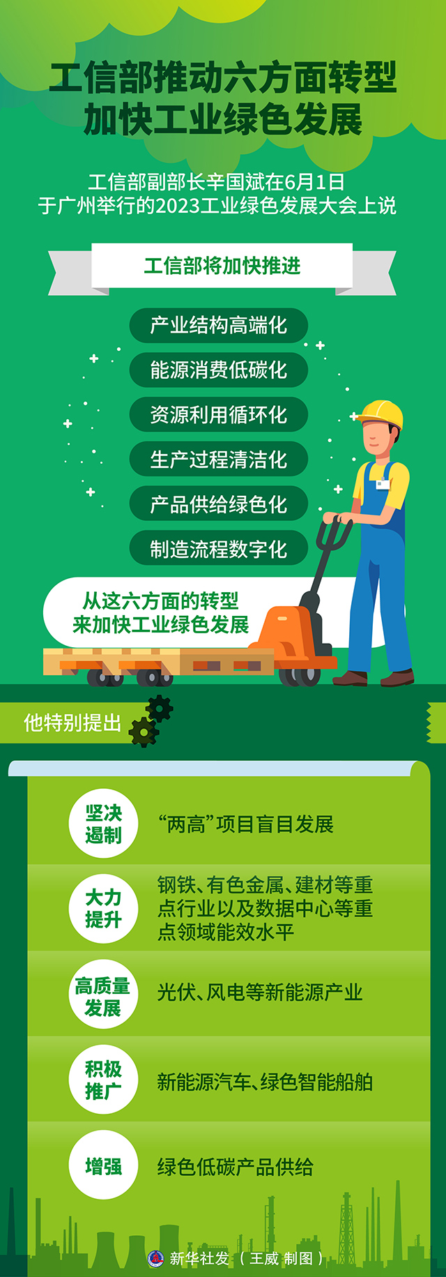 工信部副部長辛國斌在6月1日于廣州舉行的2023工業(yè)綠色發(fā)展大會(huì)上說,要通過加快推進(jìn)產(chǎn)業(yè)結(jié)構(gòu)高端化、能源消費(fèi)低碳化、資源利用循環(huán)化、生產(chǎn)過程清潔化等六方面轉(zhuǎn)型,全面推進(jìn)工業(yè)綠色發(fā)展,將工業(yè)綠色發(fā)展作為新型工業(yè)化的重點(diǎn),打造綠色新動(dòng)能。