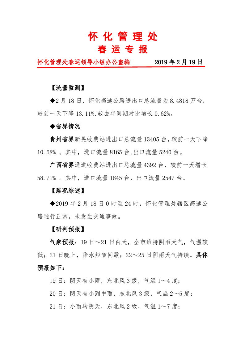 2019年懷化市高速公路春運(yùn)專報(bào)(第28期)