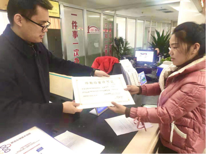 圖為“一件事一次辦”綜合窗口工作人員辦結柴女士申請辦理的我要開印刷企業(yè)(不含出版物類)事項后為其發(fā)放相關證件。