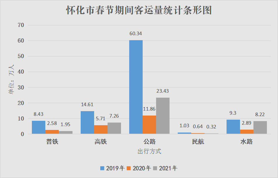 春節(jié)假期期間,懷化市綜合交通發(fā)送旅客41.18萬(wàn)人,同比2020年上升74.02%,同比2019年下降61.1%。其中普鐵1.95萬(wàn)人,同比2020年下降24.31%,同比2019年下降76.86%;高鐵7.26萬(wàn)人,同比2020年上升27.22%,同比2019年下降50.32%;公路23.43萬(wàn)人,同比2020年上升102.16%,同比2019年下降61.17%;水路8.22萬(wàn)人,同比2020年上升184.92%,同比2019年下降11.62%;芷江機(jī)場(chǎng)3165人,同比2020年下降50.07%,同比2019年下降69.41%。受疫情影響,今年春節(jié)期間群眾出行旅游大幅減少,大部分市民選擇在懷就地過(guò)年,高速公路偶有堵塞現(xiàn)象,公路、水路客流量有所回暖,但未達(dá)到正常水平,部分普鐵線路停運(yùn),往年最熱鬧的高鐵客流量也有所減少。全市春運(yùn)總體平穩(wěn)、安全、有序。(市春運(yùn)辦 劉二華)