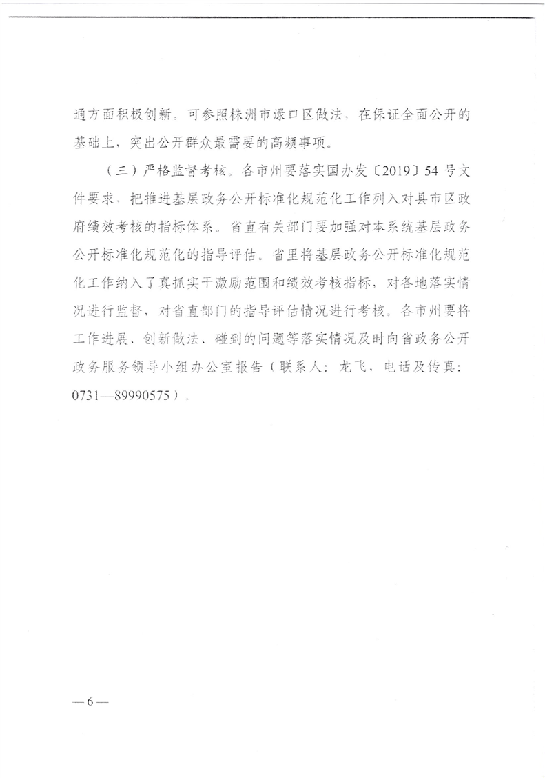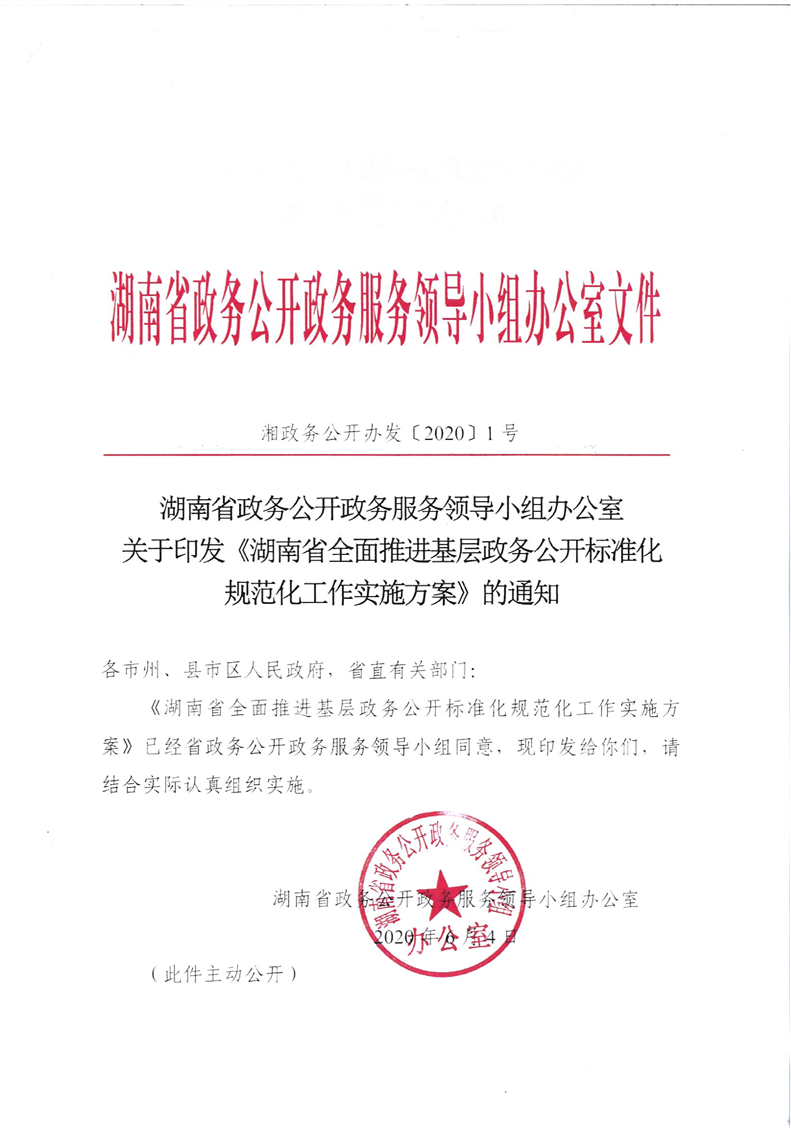 湖南省政務(wù)公開(kāi)政務(wù)服務(wù)領(lǐng)導(dǎo)小組辦公室關(guān)于印發(fā)《湖南省全面推進(jìn)基層政務(wù)公開(kāi)標(biāo)準(zhǔn)化規(guī)范化工作實(shí)施方案》的通知(湘政務(wù)公開(kāi)辦發(fā)〔2020〕1號(hào))