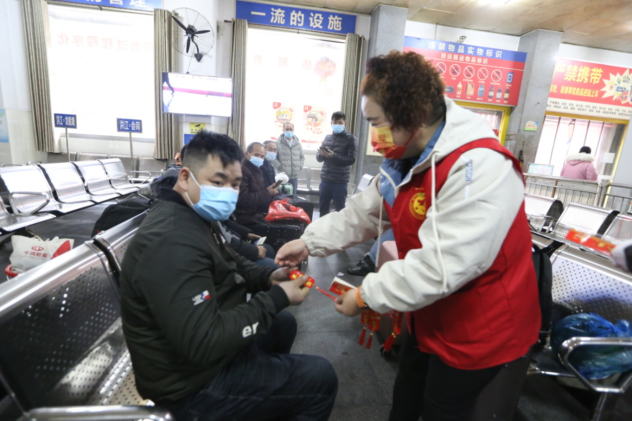志愿者為春運(yùn)首天首批幸運(yùn)旅客送上專屬福袋和祝福。隨后,志愿者一起為候車大廳掛燈籠、貼福字,為旅客營(yíng)造濃厚的節(jié)日氛圍,并圍繞重點(diǎn)旅客開展搬運(yùn)行李、票務(wù)協(xié)助等志愿服務(wù),做好疫情防控、安全生產(chǎn)等宣傳。(洪江區(qū)春運(yùn)辦