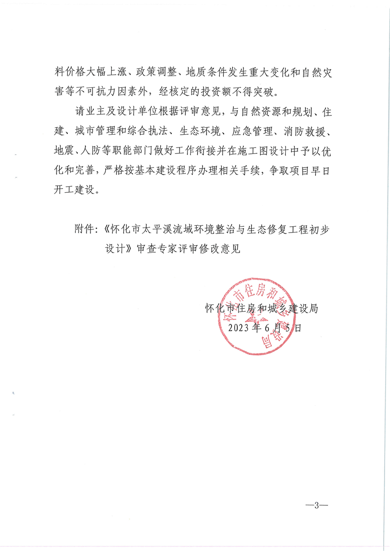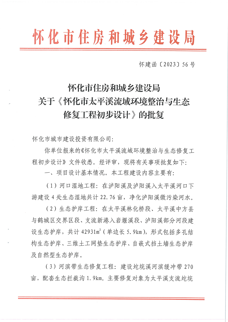 關(guān)于《懷化市太平溪流域環(huán)境整治與生態(tài)修復(fù)工程初步設(shè)計》的批復(fù)