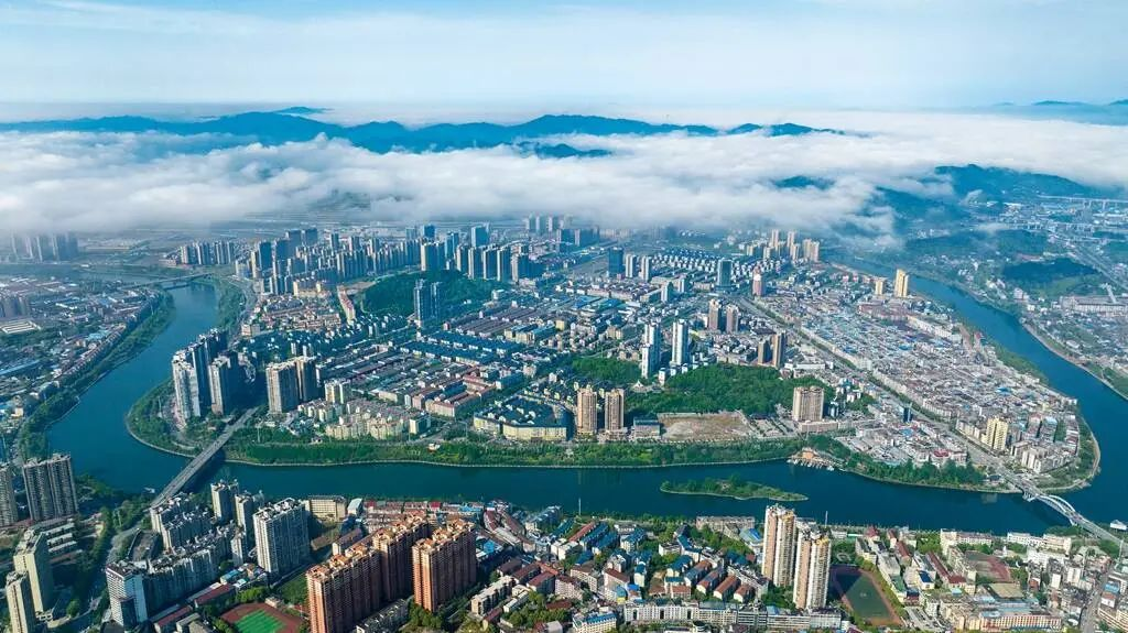 (藍(lán)天白云,碧水繞城,如詩(shī)如畫(huà)。)