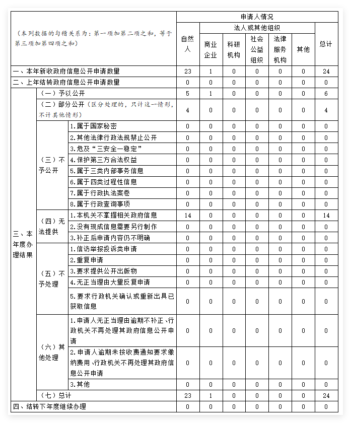 本年度報(bào)告根據(jù)《中華人民共和國政府信息公開條例》(以下簡稱《條例》)、湖南省政務(wù)公開領(lǐng)導(dǎo)小組辦公室《關(guān)于貫徹落實(shí)(中華人民共和國政府信息公開條例)實(shí)施方案》(以下簡稱《實(shí)施方案》)及《懷化市政府信息公開實(shí)施細(xì)則》(以下簡稱《細(xì)則》)的有關(guān)規(guī)定,由鶴城區(qū)政務(wù)公開領(lǐng)導(dǎo)小組辦公室編制。全文由總體情況、主動(dòng)公開政府信息情況、收到和處理政府信息公開申請(qǐng)情況、政府信息公開行政復(fù)議行政訴訟情況、存在的主要問題及改進(jìn)措施、其他需要報(bào)告的事項(xiàng)等六部分組成。本報(bào)告的統(tǒng)計(jì)數(shù)據(jù)時(shí)限為2024年1月1日至12月31日,通過懷化市鶴城區(qū)人民政府門戶網(wǎng)站對(duì)外公布。如對(duì)報(bào)告有任何疑問、意見,請(qǐng)與懷化市鶴城區(qū)政務(wù)服務(wù)中心聯(lián)系(地址:懷化市鶴城區(qū)政務(wù)服務(wù)中心五樓501室,郵編:418000,電話:0745-2338221,電子郵箱:hcqzwzx@126.com)。