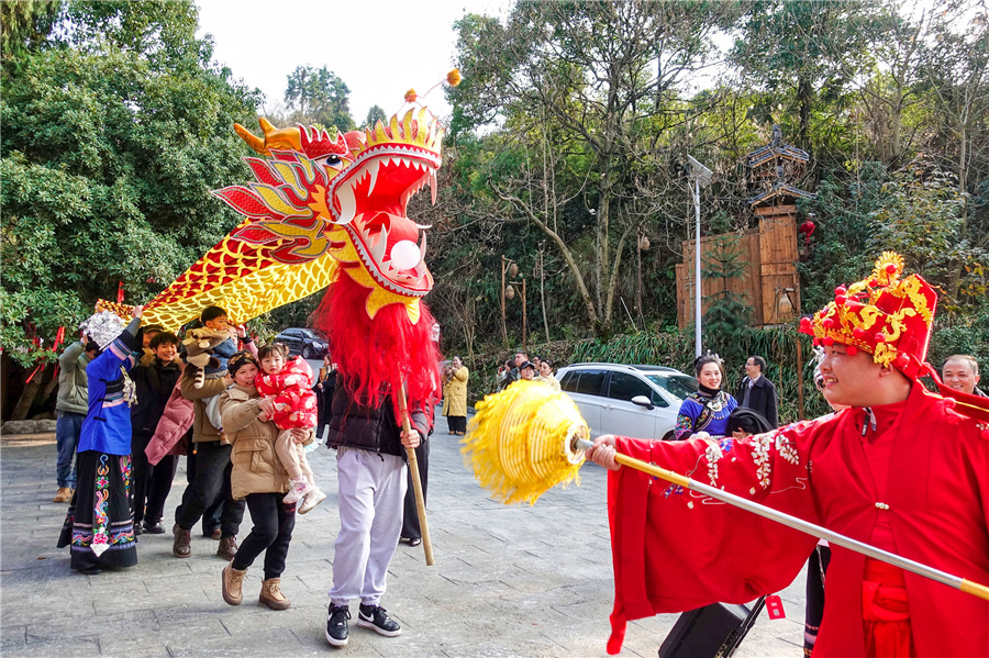 2月3日,大年初六,麻陽隆家堡鄉(xiāng)云果園,游客參與舞龍燈活動。